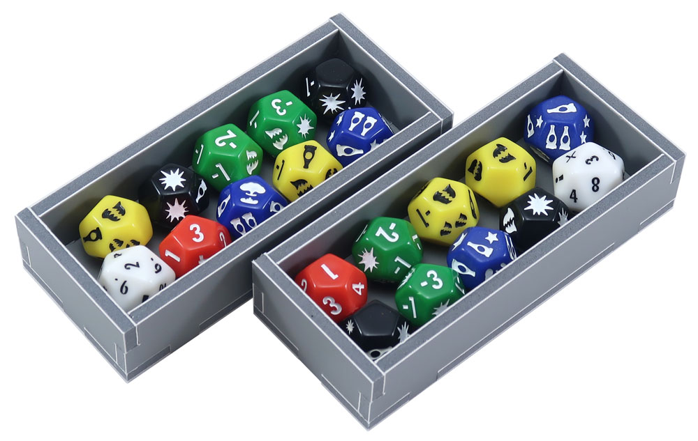 Insert compatible with Fallout: Wasteland Warfare®, and has space for over 310 sleeved large cards and 1,150 sleeved small cards, plus the Nuka-Cola Caps and the Extra Dice Set. The design provides both efficient storage and improved game play. Many of the trays can be utilised during the game, and they greatly aid set-up and clear-away times.