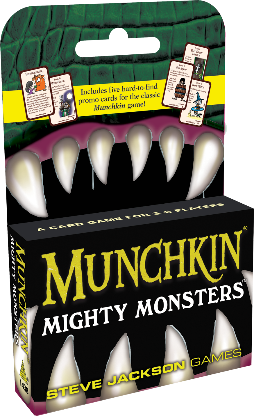 Munchkin Mighty Monsters is a fast-playing card game based in the world of Steve Jackson's best-selling Munchkin. You and your monster buddies are hanging out in the dungeon, just waiting to wallop some munchkins...but there are just too many of them! Play cards by matching either the rank or color of the last card played. Be careful – if you get stuck and can't play a card, bad stuff happens – the munchkins wallop you instead! Get walloped too often, and the munchkins defeat you. The first player who gets defeated three times loses the game, and everyone else wins! Includes five Munchkin promo cards, because everyone needs more cards!