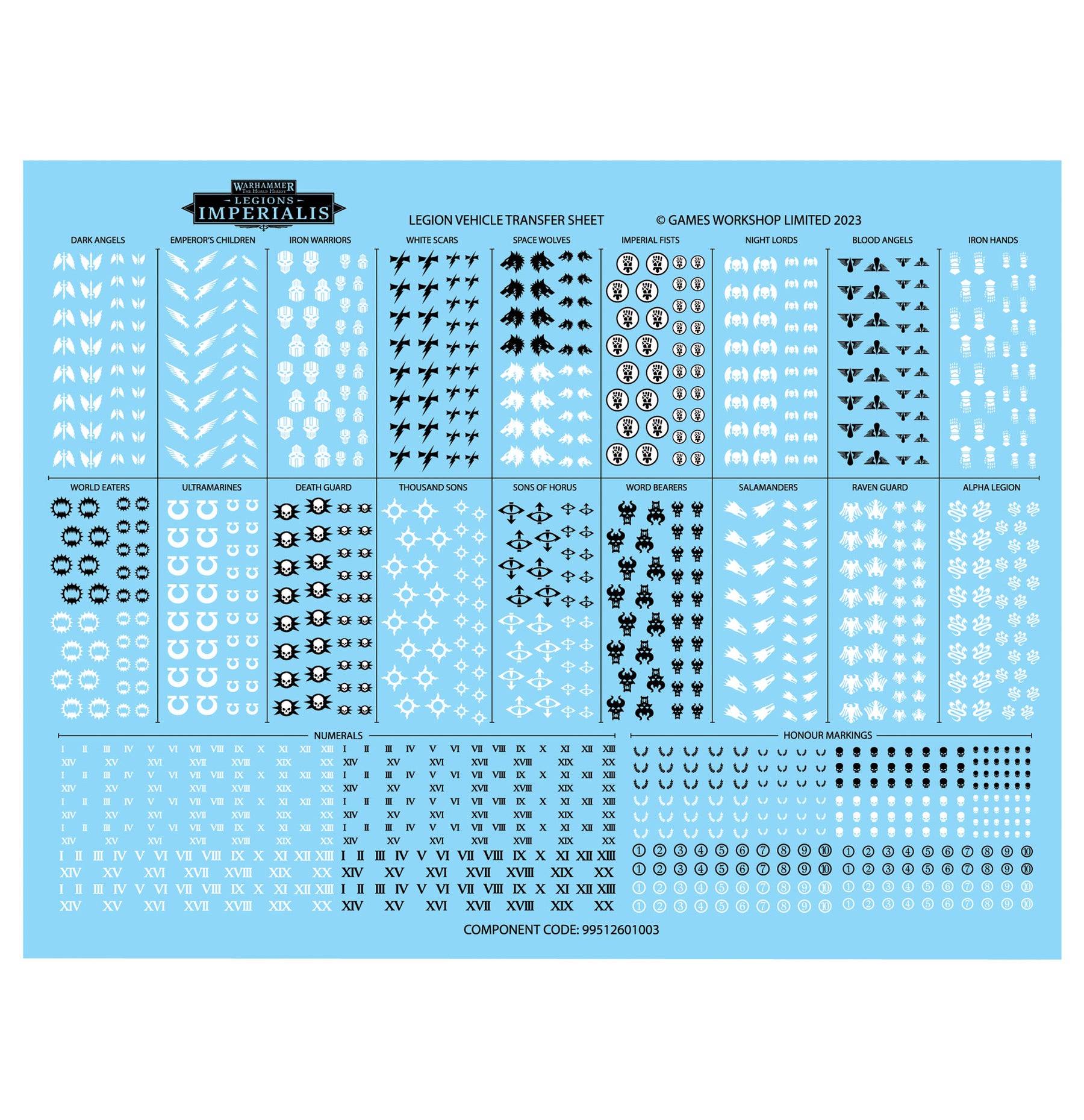 The kit also comes with 3x Legion Vehicle Transfer Sheets, each containing 1,130x high-quality waterslide transfers, including markings for all 18 Legions, numerals, and honour markings.