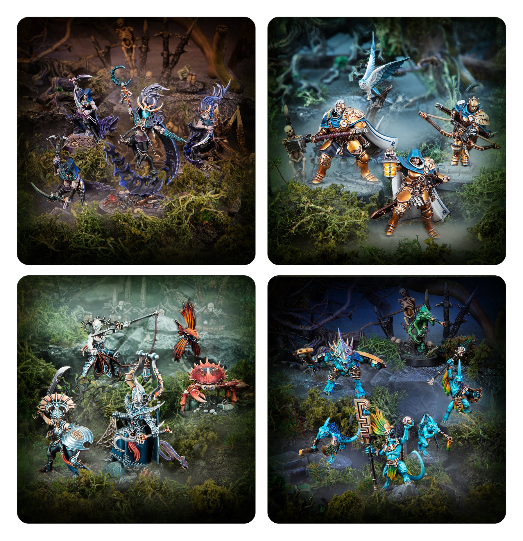 This kit collects four Order-themed warbands for Warhammer Underworlds. All the miniatures are push-fit, moulded in coloured plastic, and include scenic bases on the frames so you can start playing quickly. You'll also find warscroll cards and fighter cards for each warband. The Shadeborn are an aggressive Strike warband, Xandire's Truthseekers are a versatile Flex warband, The Starblood Stalkers are a tough Take and Hold warband, and Elathain's Soulraid features the Mastery playstyle, which rewards players for careful management.