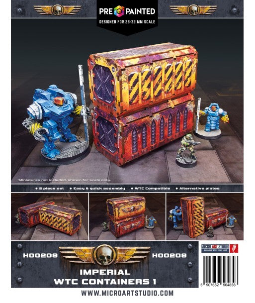 The Imperial Containers PREPAINTED set consists of 2 containers, dedicated for Warhammer 40000 and/or other sci-fi gaming systems.