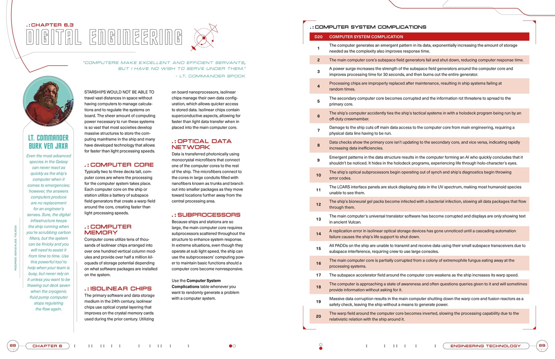 • Insight on diagnostic levels, transporters, turbolifts, and environmental and utility systems, as well as digital engineering elements, such as computer systems and their various components.