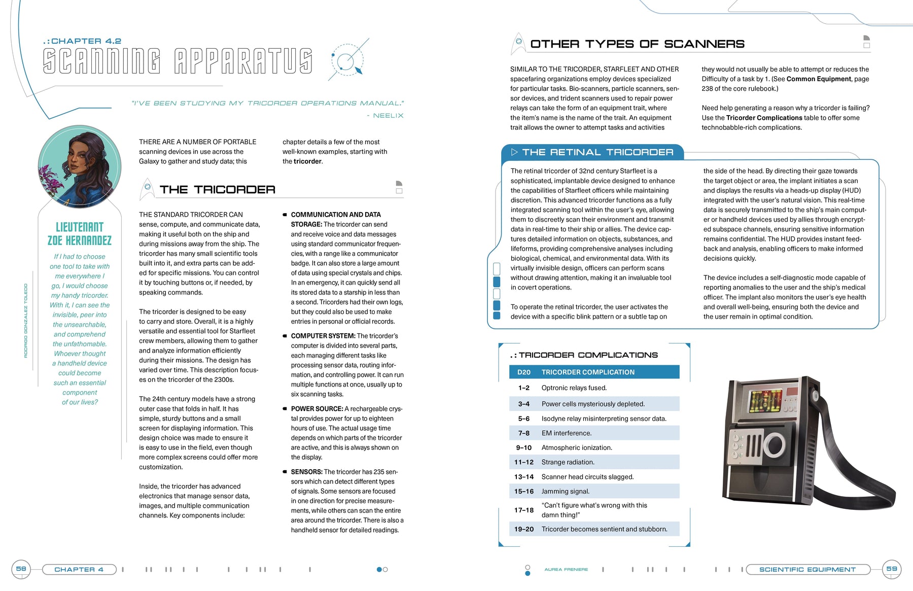 • A wealth of information on a wide variety of scientific gear, tricorders, and types of laboratories; and advice on conducting away missions and some of the gear an away team might utilize.