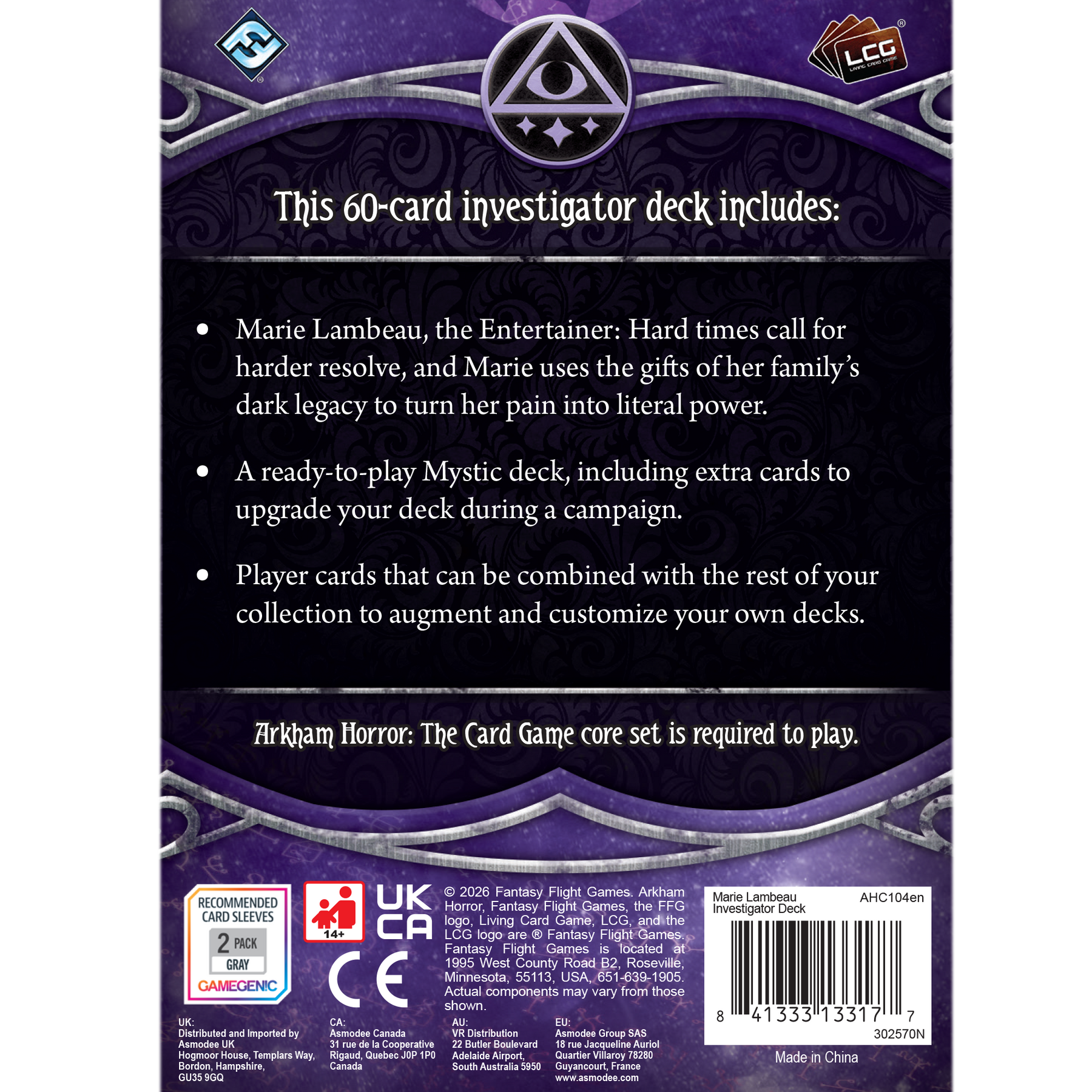 This Investigator Deck for Arkham Horror: The Card Game comes with a pre-built, ready-to-play Mystic deck, allowing you to jump into a campaign from the moment you open the box. Also included are additional cards for upgrading the deck during a campaign.