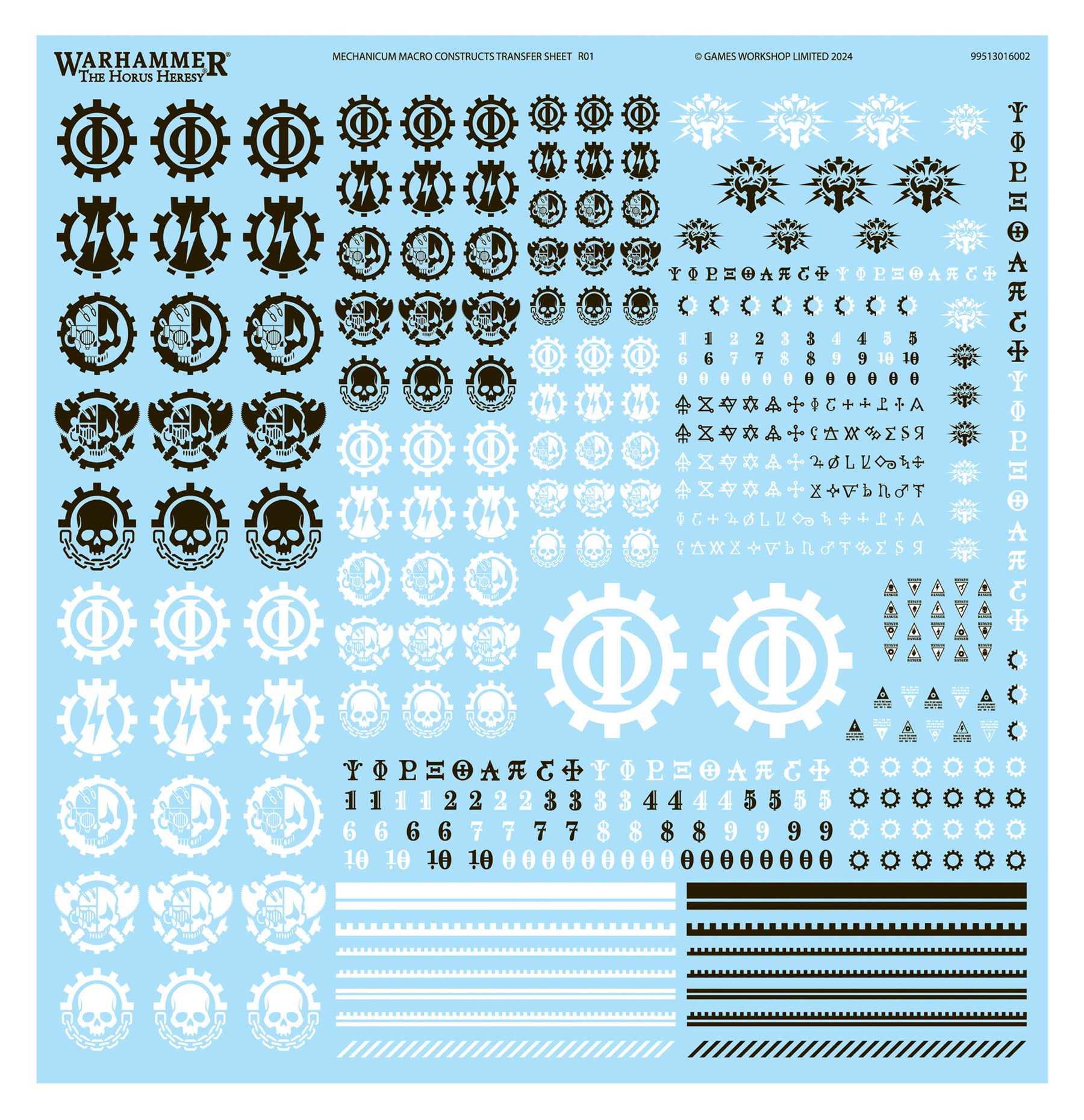 This kit is supplied with 1x Mechanicum Constructs Transfer Sheet, containing 558 high-quality waterslide transfers. These include symbols for Opus Machina, Opus Taghmata, Iungum Cybernetica, Covenant Cybernetica, and Fracta Aedificium, along with other lines, markings, and cogs to decorate your miniatures.