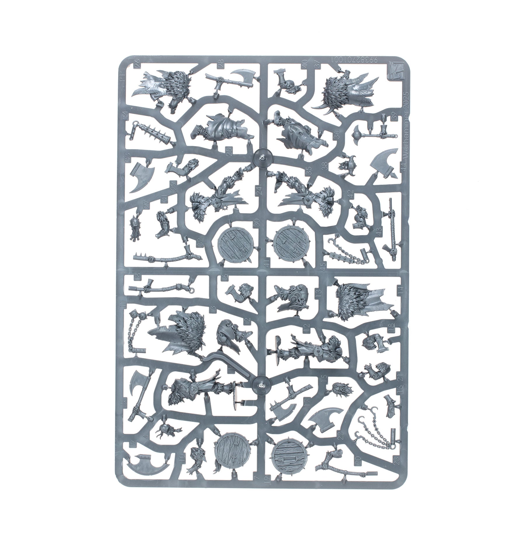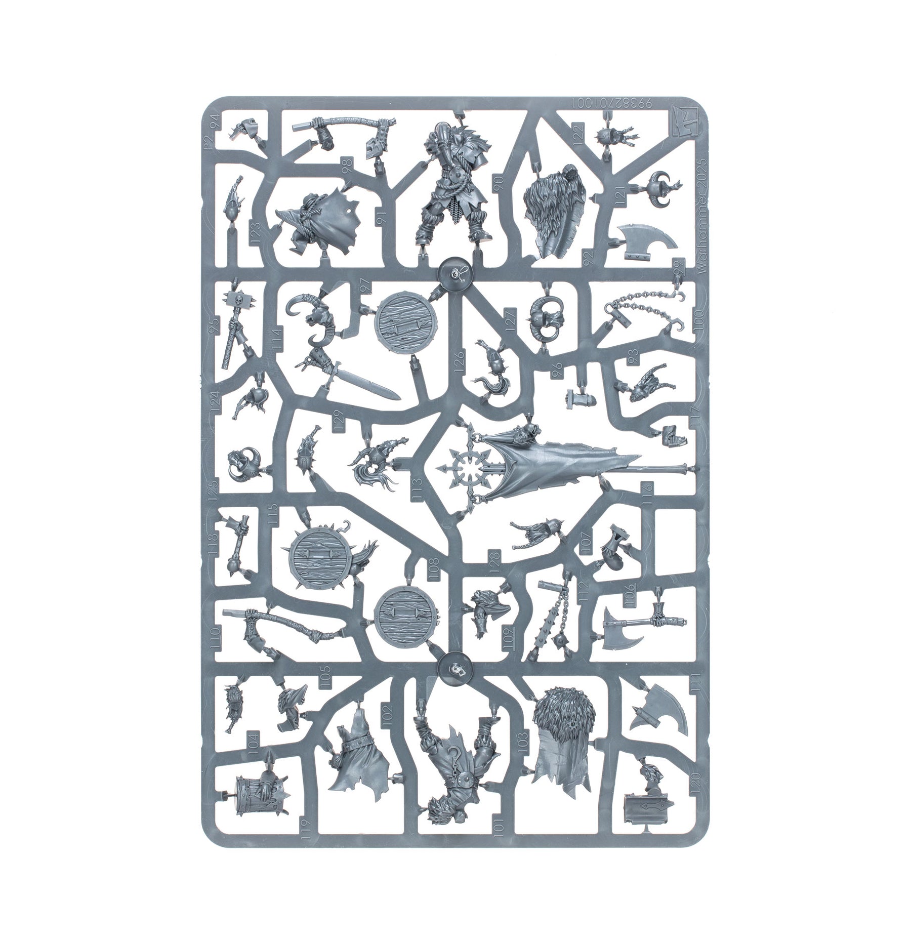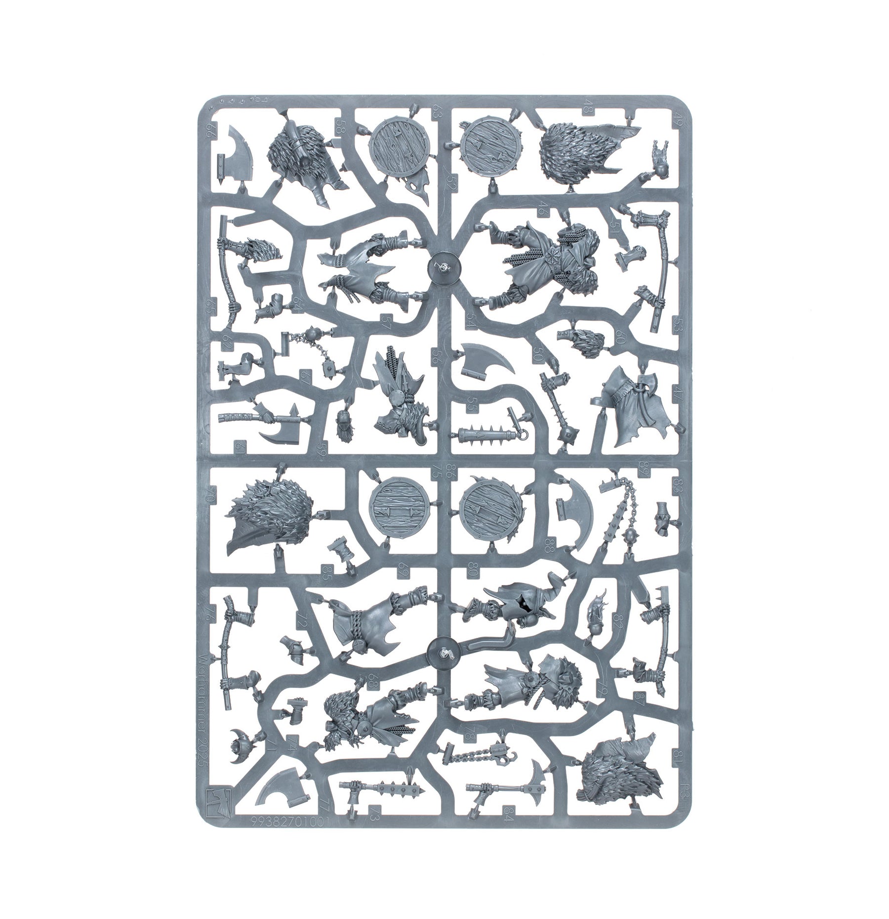 The contents of this box can be assembled as one large unit of 20 warriors, or two smaller units of ten warriors – each with their own optional champion, standard bearer, and musician. Every Marauder can be armed with either a hand weapon and shield, a great weapon, or a flail. The hand weapons and shields are interchangeable across the miniatures, and they each have a choice of head – helmeted or bare.