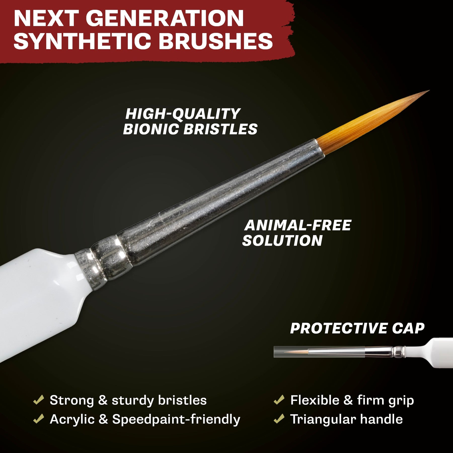 Everything you need to paint anything. The Mega Brush Set brings together our most-used brush types—detail, layering, basecoating, and drybrushing—so you can move from tiny symbols to vehicles and terrain without missing a step. Durable, easy-to-control bristles keep their shape and deliver smooth coverage. Packed in updated, eco-friendly packaging that keeps your tools organised between sessions.