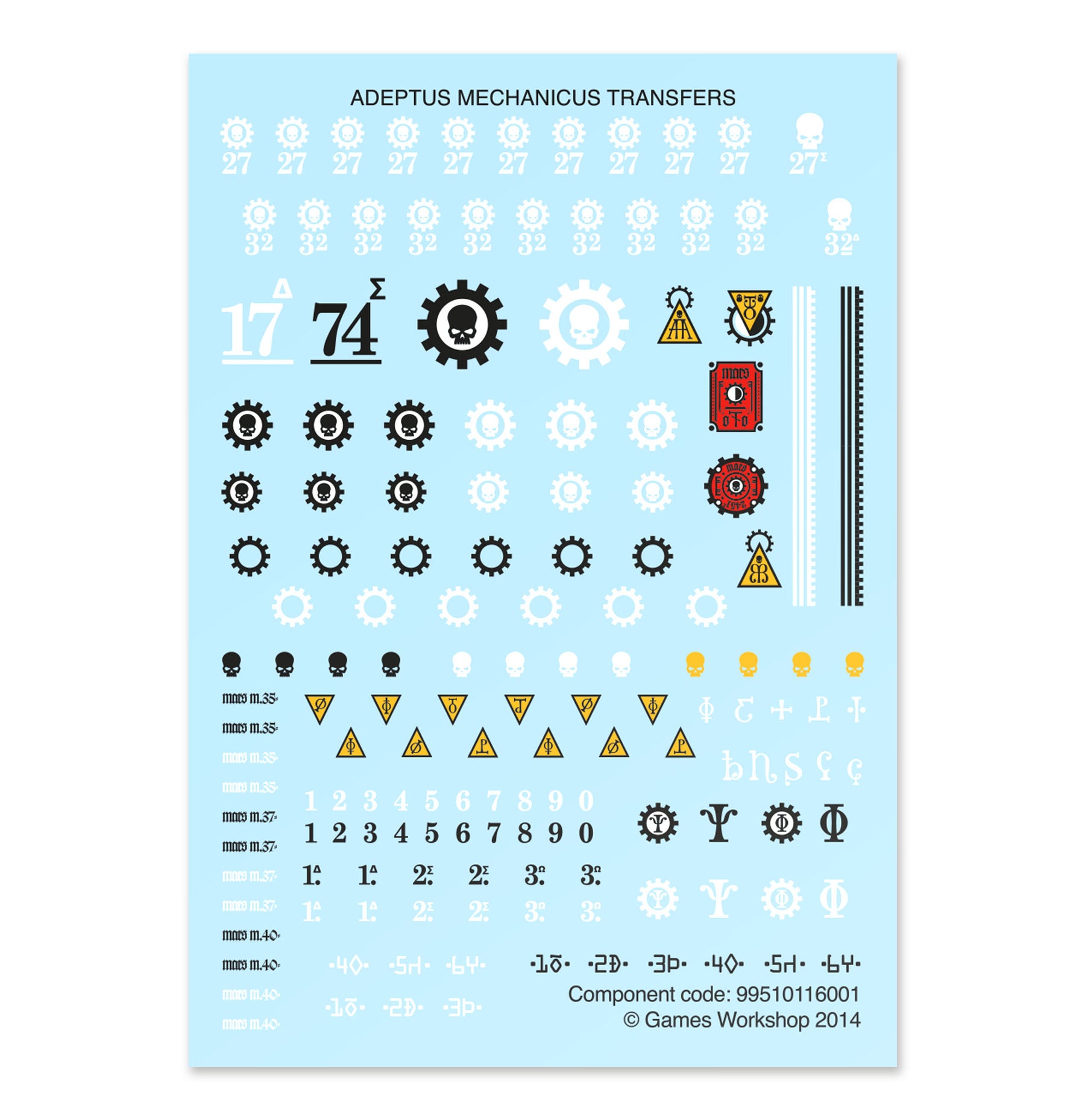 The Adeptus Mechanicus Transfer Sheet features 320 high-quality waterslide transfers. These include Mechanicus symbols, along with warning sigils, numbers, and more to decorate your miniatures.