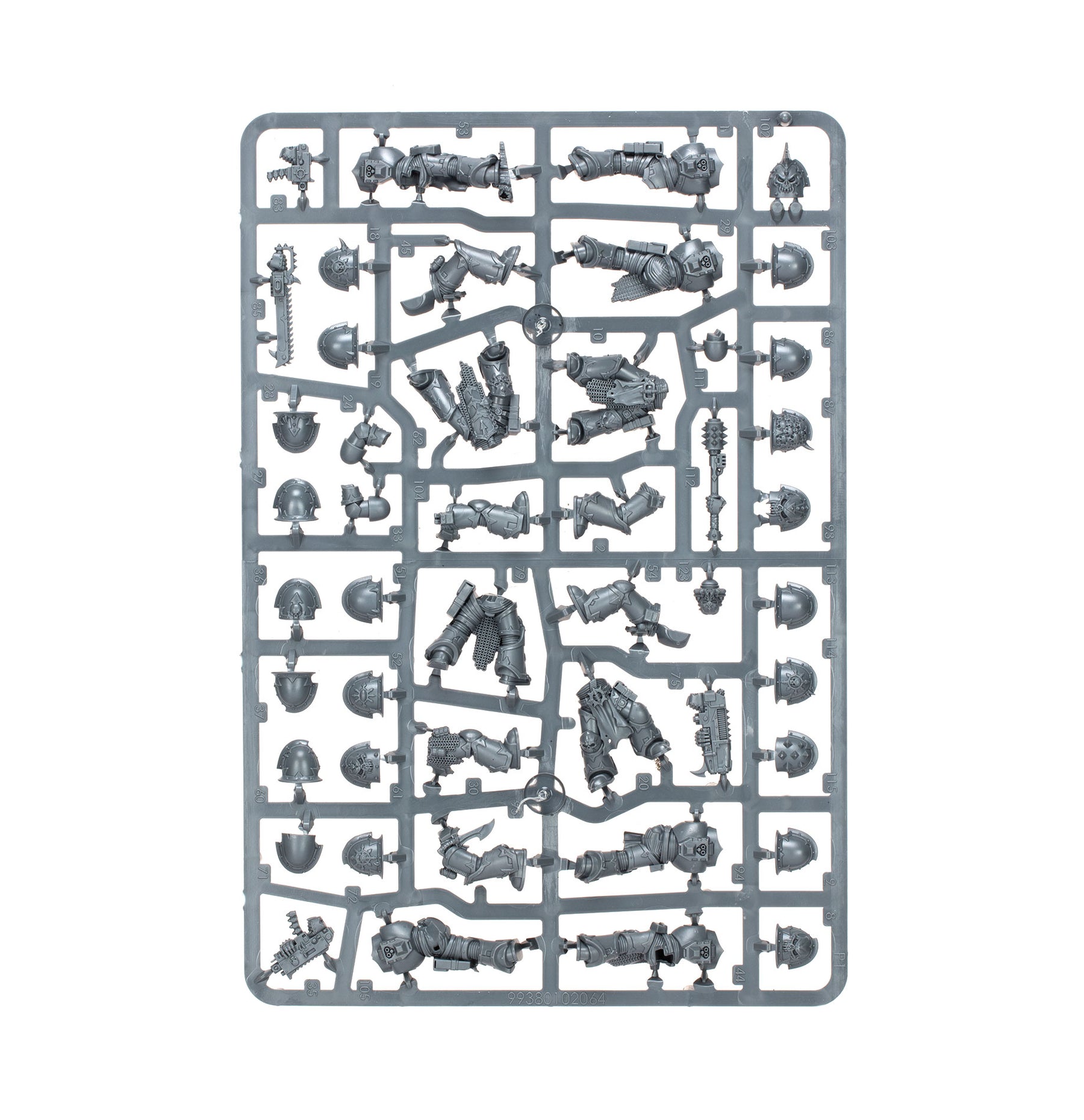 Each of the Legionaries can be armed with a boltgun or bolt pistol and an Astartes chainsword, and there are 11 interchangeable heads and 21 interchangeable shoulder pads. You can arm Legionaries with a plasma gun, flamer, meltagun, heavy bolter or missile launcher, and there are parts to build up to 2 Aspiring Champions.