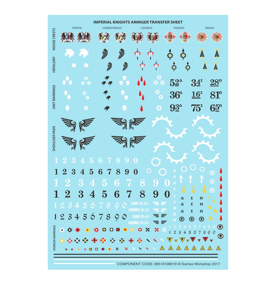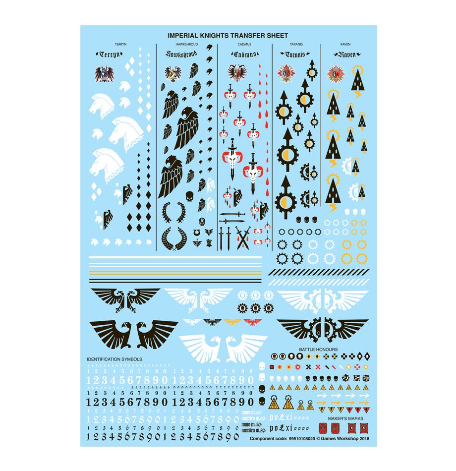 The Imperial Knights Transfer Sheet features 583 high-quality waterslide transfers. The Imperial Knights Armiger Transfer Sheet features 277 high-quality waterslide transfers. These sheets include decals for Knight Households Terryn, Hawkshroud, Cadmus, Taranis, and Raven, alongside several miscellaneous markings such as identification symbols, battle honours, and maker's marks.