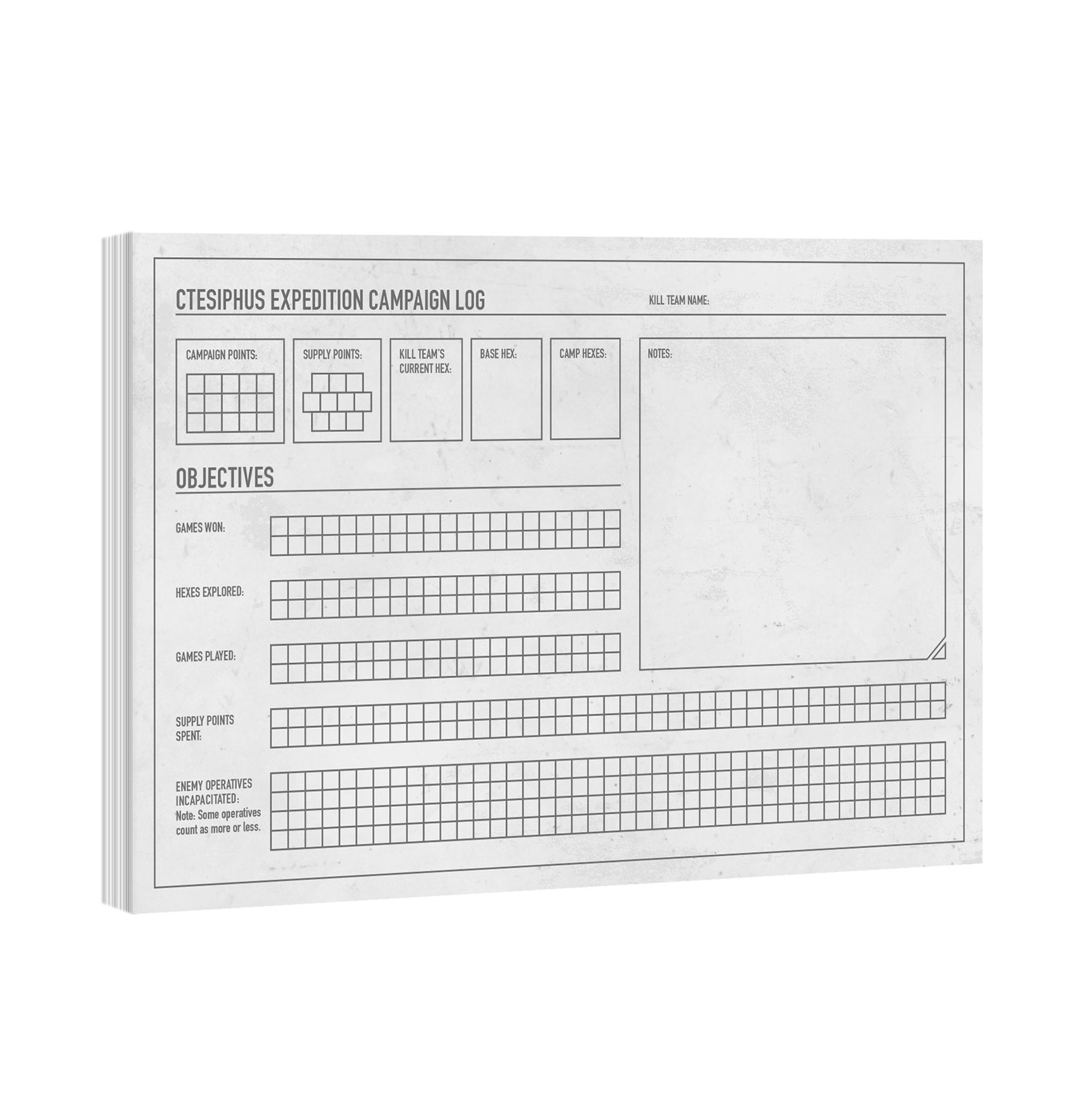 – 1x Campaign Log Pad: Easily track the progress of your kill team throughout a campaign with 40 tear-off log sheets, each measuring 210mm by 140mm.