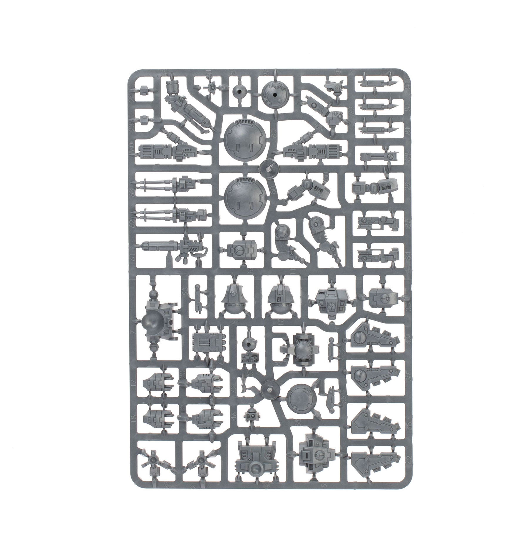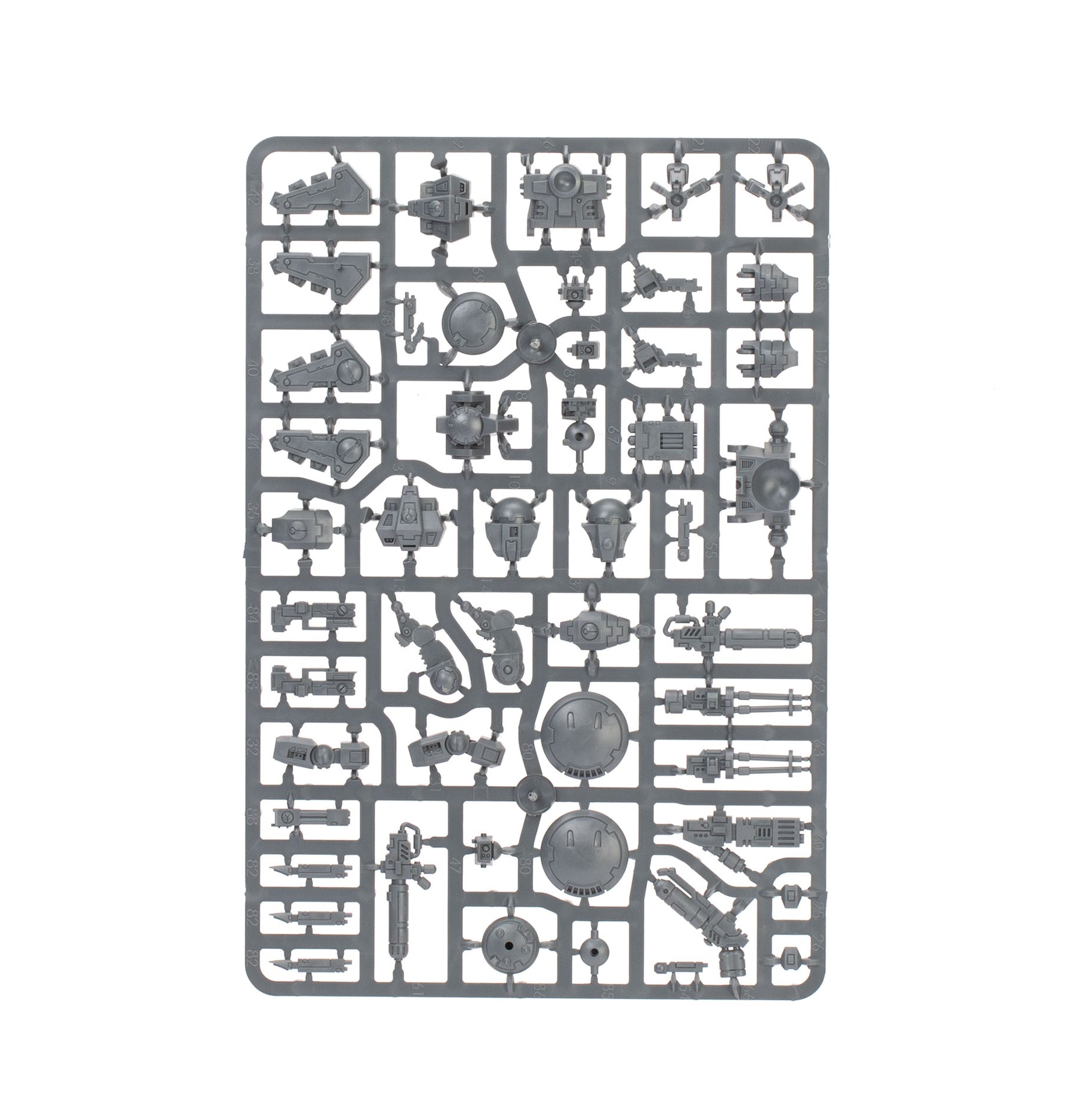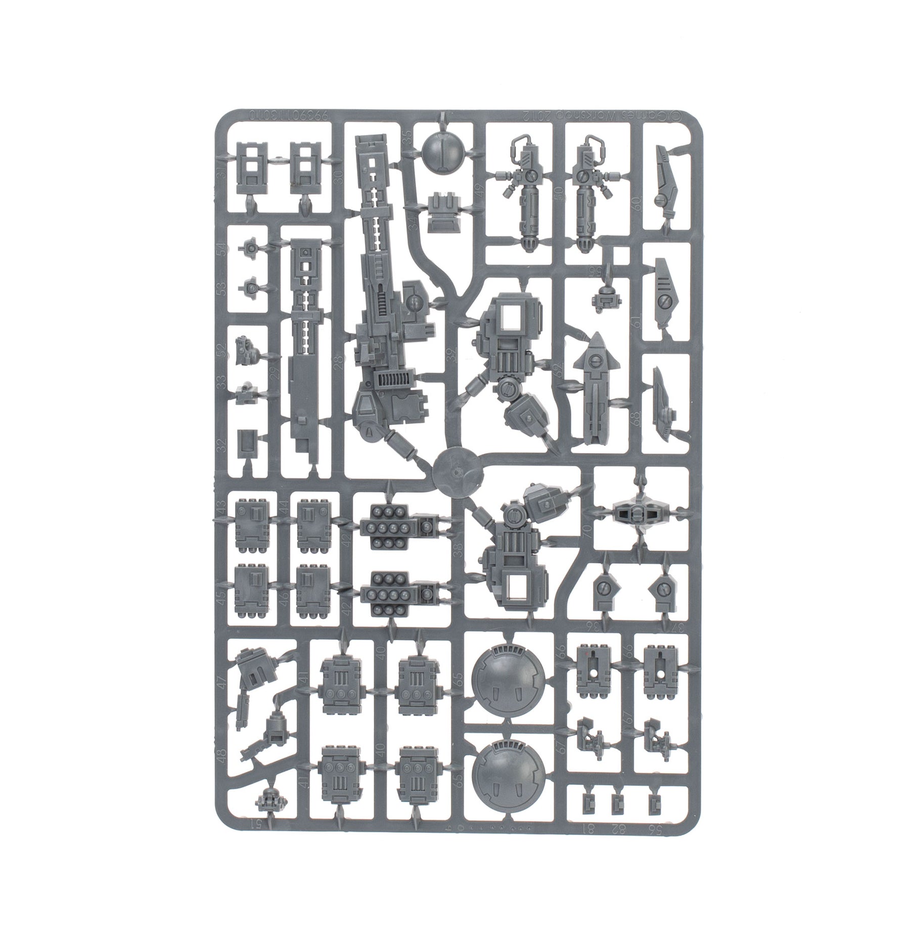 The Crisis Battlesuits can each be built on the ground or with flying stems as if just landing or taking off. The heads, knee pads, and shoulder pads are interchangeable, as are the weapons – there are four plasma rifles, three T'au flamers, four fusion blasters, four burst cannons, three missile pods, and three shield generators. The six drones can be built as up to three gun drones, up to three shield drones, and up to three marker drones. There are also parts to build an optional Shas'vre or Iridium-class XV8-02 Crisis Battlesuit.