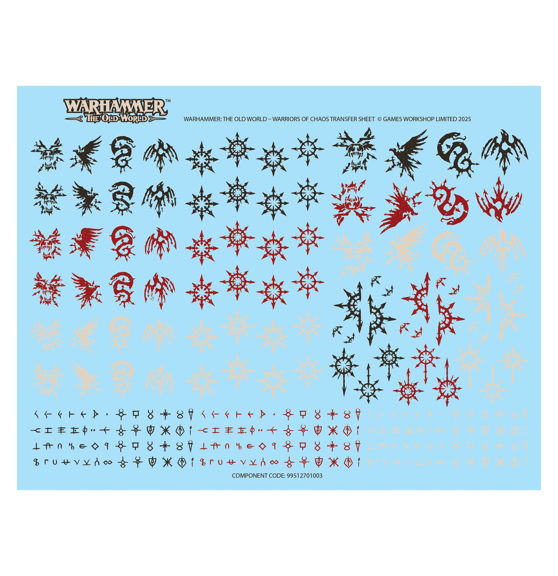 This kit is supplied with 1x Warriors of Chaos Transfer Sheet, containing 246x high-quality waterslide transfers. These include markings for the Cult of the Bloodied Hound, the Cult of the Slithering Serpent, the Cult of the Carrion Crow, and the Cult of the Fell Raptor, along with other Chaos symbols and cursed runes.