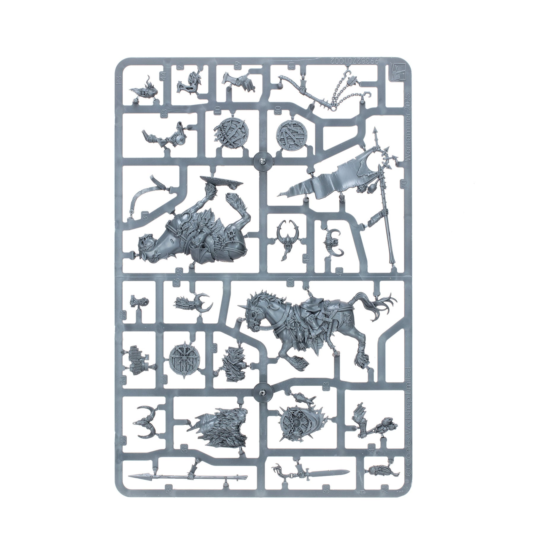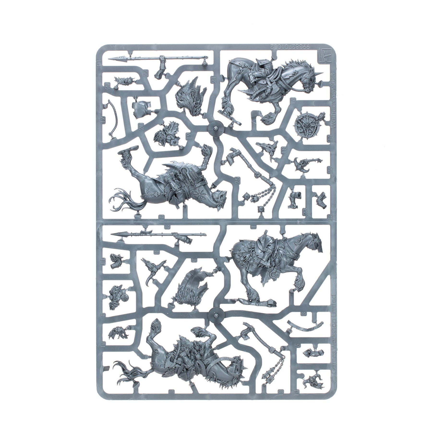 The contents of this box can be assembled as one large unit of ten Horsemen, or two smaller units of five Horsemen – each with their own optional champion standard bearer, and musician. Every Marauder can be armed with either a spear and a shield, or a flail, and they each have a choice of head – helmeted or bare.